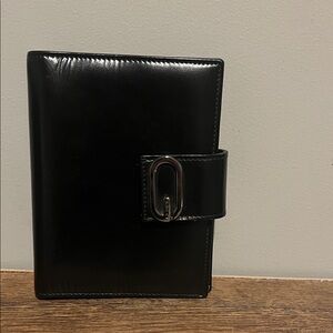 Elegant black leather wallet with a distinctive silver logo clasp. Ideal for stylish organization.