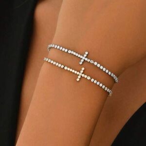 This minimalist bracelet showcases a sleek silver chain-link design, highlighted by a horizontal cross charm. Its adjustable closure ensures a perfect fit, while the silver finish adds a subtle shine, making it a versatile accessory for any occasion. In stainless steel