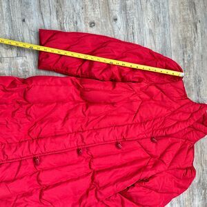 Bold vintage 80s red down puffer trench coat with a long, cozy silhouette and oversized Large fit. Unique bright color with warm insulation—perfect for making a statement during winter, layering over casual outfits, or adding retro flair to cold-weather wardrobes. Made with down insulation.