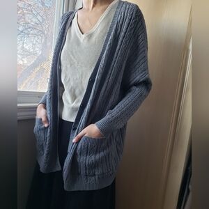 Stay cozy and stylish with this gray cable knit cardigan and sweater set. Perfect for layering, this set offers comfort and elegance for any occasion.
