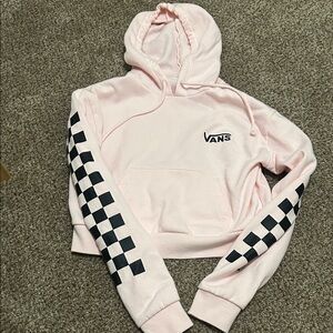 Light pink Vans hoodie with iconic black checkered sleeves. Casual and trendy. Slightly cropped