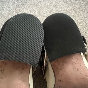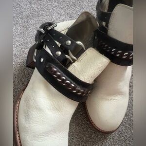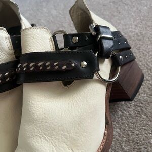 Stylish cream ankle boots with brown strap detailing. Features metal buckles and a sturdy heel. Perfect for casual wear.