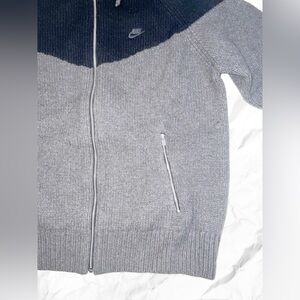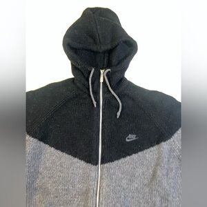 Nike zip-up wool sweater with hood. Black and gray color scheme. Nike futura logo embroidered on left chest. Drawcord around hood. Rib knit cuffs and hem. Zip pockets. Perfect for casual outings.