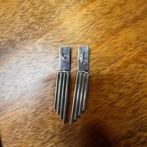 Elegant silver dangle earrings featuring a striking green accent. Perfect for adding a touch of sophistication to any outfit.