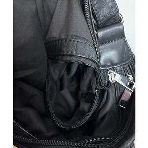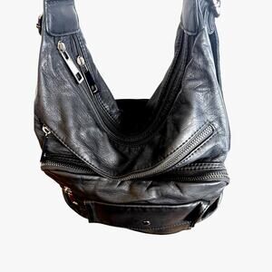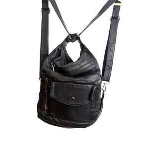 Soft black faux leather convertible backpack hobo bag with multiple zip pockets and adjustable straps. Can be worn as a shoulder bag, crossbody, or backpack for everyday use, travel, or casual wear.