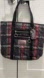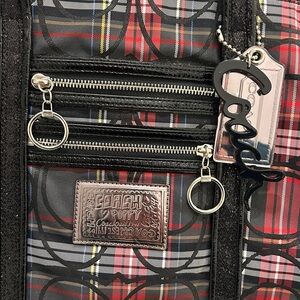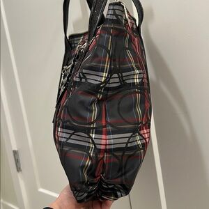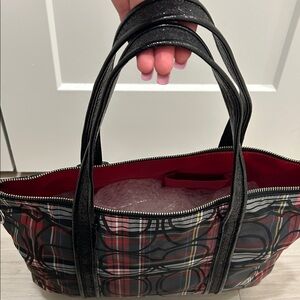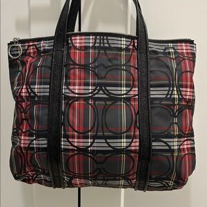 Elegant Coach tote with a bold black and red plaid pattern with black sequin trimming and handles. Ideal for daily use, but great for any fun night out, festivity, or the holidays.