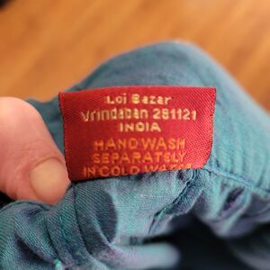 Vibrant turquoise teal, full-sweep Gangotri maxi skirt from Vrindavan, India. Features intricate mixed-media borders with metallic Zari embroidery and block-print style florals. High waist fit. Back zip with drawstring to cinch waist. Heavy bottom hem and horizontal paneling provides excellent drape and movement (great for dancing). Great for renaissance festival, renfair. No fabric content tag but the body is likely cotton. This is a substantial and dramatic skirt. Very well constructed with French finished seams. Best for tall or long legs (see measurements). In excellent pre-loved condition.