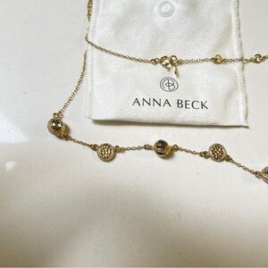 Elegant Anna Beck necklace featuring a delicate gold-tone chain with alternating signature Balinese dot discs and faceted dark stone stations. The handcrafted details add texture and depth, creating a timeless, versatile piece perfect for everyday wear or layering. Comes from a smoke-free home and is in great pre-owned condition.