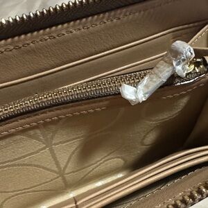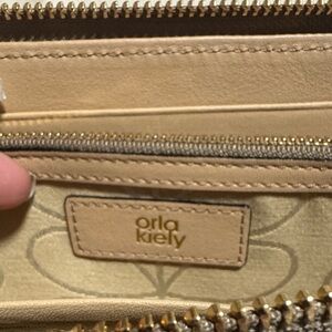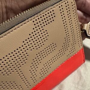 Stylish Orla Kiely wallet with a vibrant bright orange/red accent. Features a unique perforated pattern. Perfect for essentials. Like new condition.