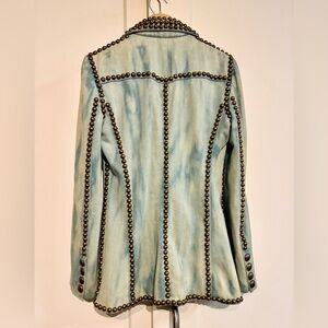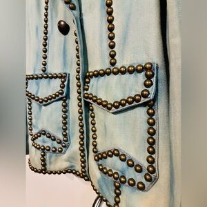 • All-over bronze studding: Hundreds of antique bronze studs meticulously hand-applied along every seam, collar, pockets, cuffs, and hem. From afar it has an armor-like edge; up close the craftsmanship is insane – pure rock ‘n’ roll glamour!