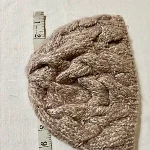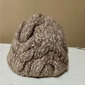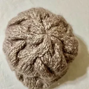 Cozy chunky knit beanie in a warm tan color. Perfect for cold weather. Blend of wool acrylic and nylon.