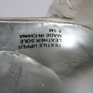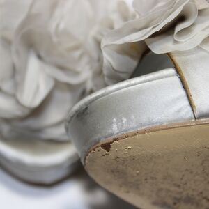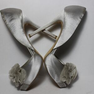 - Audrey Brooke Silver Satin Open Toe Heel with Ruffled Flower