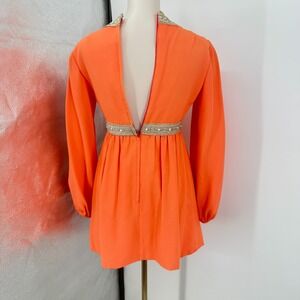 Vintage 60s Coral Highlighter Neon Babydoll Mini Dress Gold White Woven Trim
