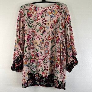 Democracy Floral Tunic Top Women Medium Boho Bohemian Pink Bell Sleeve