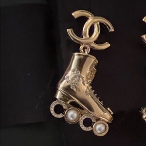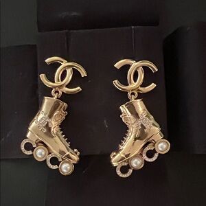 CHANEL earrings with gold Roller Skate boot and pearl accents spelling out COCO. Adds luxury to any look.