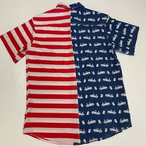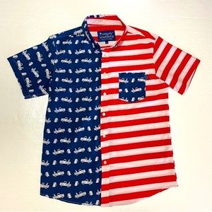 Simply Southern USA America Mens Button Down Shirt Size Small Beer Truck Dog. Red, white, blue with beer, truck, dog pattern. Front pocket with logo. Poly blend comfort stretch fabric. 21"x28"
