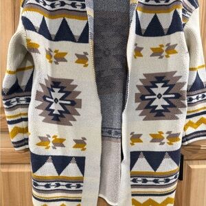 Chili & Lime open sweater layer cardigan with a unique super cute Aztec, western, boho pattern. Features yellow, brown, and cream tones. Great condition.
