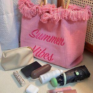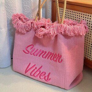 Pink Vacation Women's Large Capacity Letter & Tassel Canvas Tote Bag