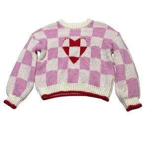 Luna Ivy Sweater Womens L Pink White Checkerboard Heart Thick Knit Pullover