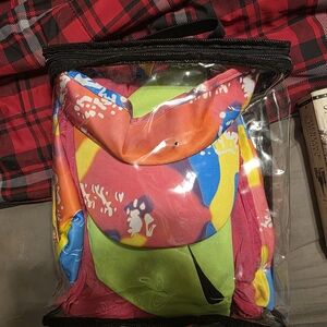 Vibrant retro vest and shorts set with a colorful pattern. Features pink, yellow, and blue swirls. Perfect for a bold statement. Just like Ken!