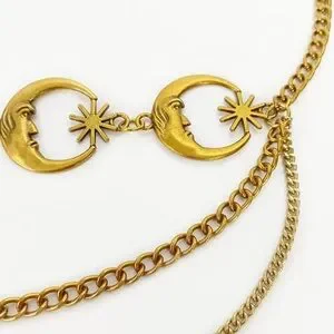 Chic gold chain belt with celestial star and moon details. Adds elegance to any look.