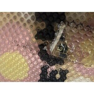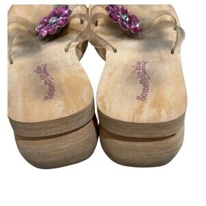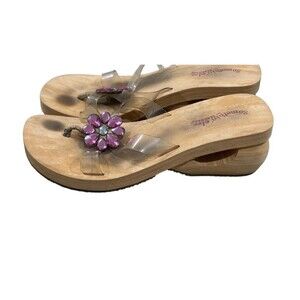 These are preowned Skechers Somethin' Else platform sandals. This style was from the early 2000s. They have a faux-wood platform wedge sole with a cutout heel, clear plastic thong strap, and a pink, jeweled flower embellishment. The toe posts show wear and are cracking see upclose images. Additionally the footbeds show some dirt.
