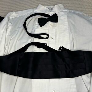 Complete Tuxedo! Jacket, Pants, Shirt, and clip on Satin Cummerbund and Bow Tie. Very good vintage condition. The gentleman that owned this Tux was a member of the Topeka Men’s Choir and wore it for performances. 100% Polyester. Pants are 40R. Shirt is XL 34/35. No size tag on jacket.