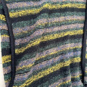 Kensie Striped Black Green Yellow Poncho Fringe Hem Blanket Shawl Button Details