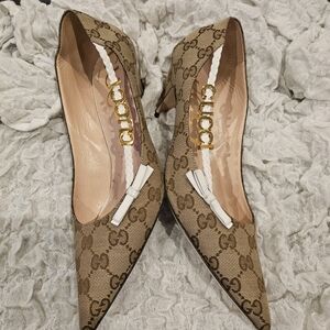 Authentic Elegant Gucci women's GG monogram with metal gold Gucci brand, pumps in a classic brown shade. Perfect for adding a touch of luxury to any outfit.