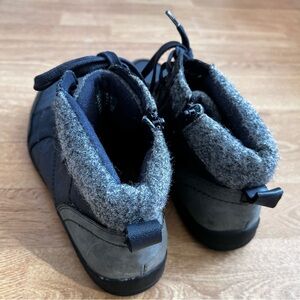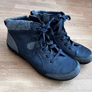 Trendy blue high-top sneakers with gray accents. Perfect for casual wear.