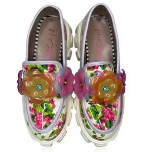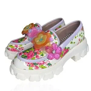 Betsey Johnson Vinie shoes, Betsey Johnson platform loafers, floral lug sole shoes, women's size 8 shoes, chunky platform slip on, Y2K platform shoes, floral statement shoes, pastel platform loafers, lug sole fashion shoes, Betsey Johnson floral shoes, colorful platform shoes, festival style shoes, retro chunky loafers, playful designer shoes, slip on platform shoes, cottagecore Y2K shoes, bold floral footwear, rhinestone flower shoes, maximalist fashion shoes