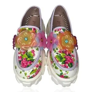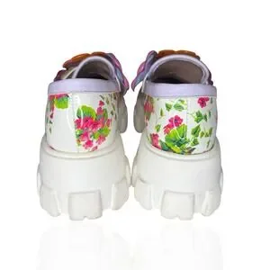 Betsey Johnson Vinie lug platform loafers featuring a vibrant multicolor floral print with oversized translucent flower embellishments across the vamp. Designed with a chunky white lug sole for added height and comfort, these slip-on shoes blend playful Y2K style with statement-making flair.