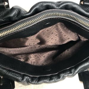Cole Haan paddle leather three compartments adjustable handles hand bag with stitching details. The middle compartment has zip pocket and top zip closure. Front and back compartments have magnet closures. Color: black. Condition: pre-owned. Pls zoom in all pictures for measurements, details and condition.