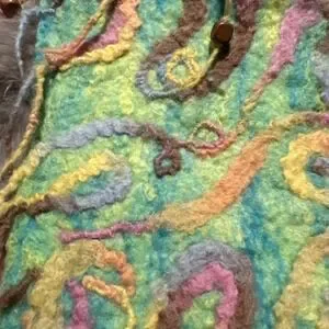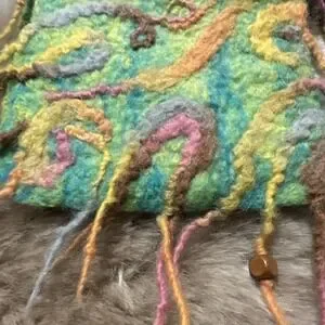 This bohemian hippie fairy festival purse is made from felted wool, with a green exterior and fringe accents. Designed as a crossbody, it is the perfect accessory for women looking to add a whimsical and unique touch to their outfit. The hippie character and bohemian theme make it a perfect statement piece for those embracing a carefree and imaginative style. The felt lining and wool handle/strap add a touch of texture and natural beauty to this eye-catching piece.