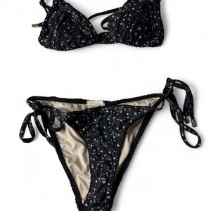 Stylish black floral bikini set perfect for a day at the beach. Features a comfortable fit and elegant design.