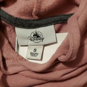Cozy Disney hoodie with 'Disneyland' text. Features pink hood and gray body. White stripe detail on sleeves. Like New condition!