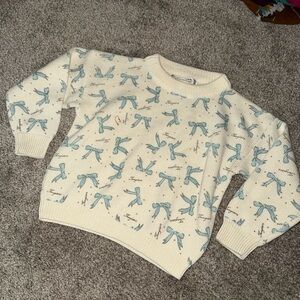 Charming cream sweater with delicate blue bow design. Ideal for a cozy and stylish outfit. I think it definitely shrunk can fit a kids 6/7