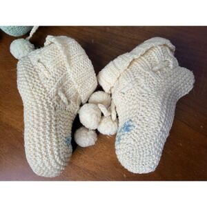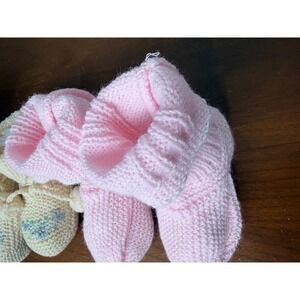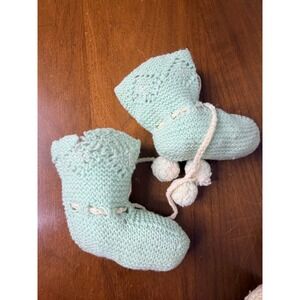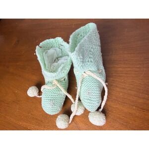 Vtg Crochet Baby Bootie Lot of 3 Infant Pink Cream Mint Green Pom Pom