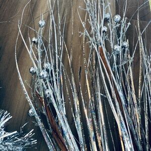 5-pc lot of Christmas holiday decorations in like new condition. Includes 3 strands shiny silver tinsel garland, one long strand greenery garland with iridescent shimmery snowflakes, and large silver sparkling floral stray stem or pick. Clean nonsmoking home.