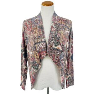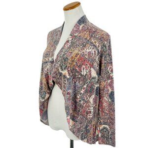 Versatile cardigan with a distressed/faded paisley & poppy knit pattern, easily dressed up or down. Ideal for layering with jeans, dresses, or leggings.