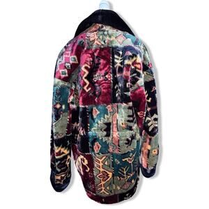 Plush southwestern tapestry with dramatic black faux fur shawl collar