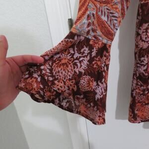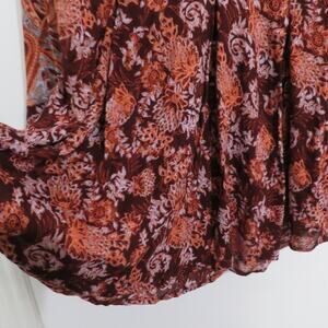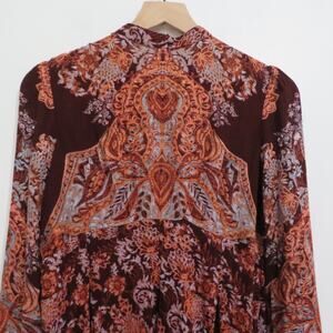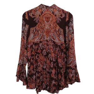 Free People high neck long sleeve top in burgundy red. High neck cut op with long statement sleeves. Long tunic style top. Floral pattern.