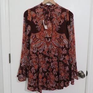 Free People Womens Sz XS Burgundy Red High Neck Cut Out Long Sleeve Tunic Top