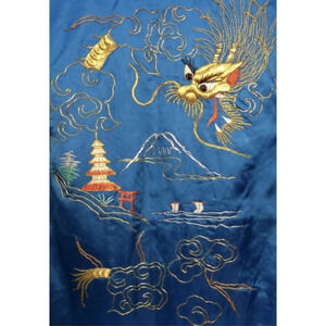 Vtg Cobalt Blue Satin Sea Serpent Landscape Embroidered Kimono Fully Lined