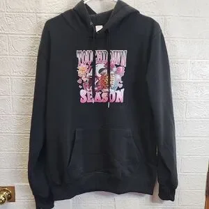 Black hoodie featuring a 'Touchdown Season' graphic in pink and white. Comfortable and stylish.