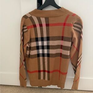 Stay cozy and stylish with this plaid button-up cardigan sweater. Featuring a blend of tan, red, and black colors, this sweater is perfect for layering.