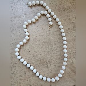 beaded necklaces set of 6. beige beads with gold hardware, one pearl necklace but the clasp on one end is broken, dark blue beads, wooden green/brown beaded necklace, wooden smaller beaded necklace and white/gold beaded necklace lot