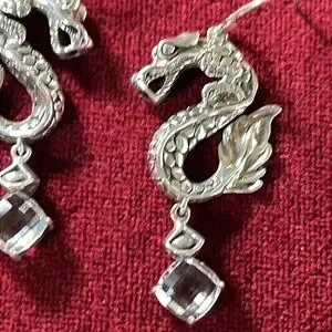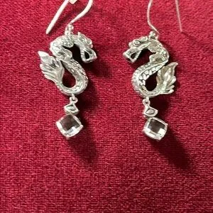 Elegant silver dragon dangle earrings add a mystical touch to any outfit. Perfect for those who love unique and bold jewelry pieces. 2” long