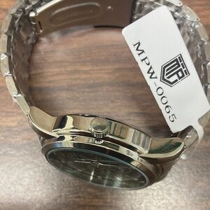 Elegant Montres Prestige watch with a silver band and green face. Perfect for any occasion.