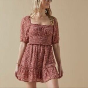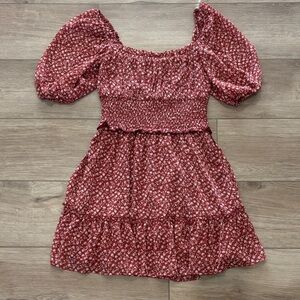 Adorable rust dress with floral pattern. Features puff sleeves and a smocked bodice. Ideal for casual outings.